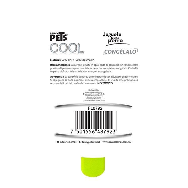 Juguete Cool refrescante en forma de paleta. Refresca a tu mascota en tiempos calurosos al brindarle u n juguete que puede contener agua o caldo de pollo congelado, además puede ser auxiliar para disminuir molestias en las encías y dientes que pueden causar incomodidad den el cachorro en época de dentición. 50 % TPR, 50% espuma TPR.