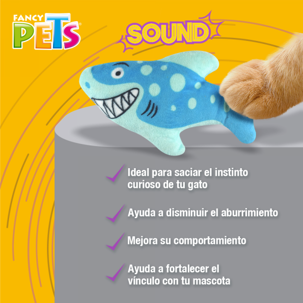 Juguete tiburón sound emite sonido al ser manipulado o al contacto por el gato. Diseñado para saciar el instinto curioso de tu gato, estimulándolo y ayudará a disminuir el aburrimiento, a mejorar su comportamiento y a fortalecer el vínculo con su dueño. 100% poliéster.
