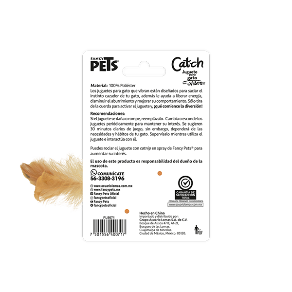 El juguete gallina con vibración de la línea catch de Fancy Pets® diseñado para saciar el instinto cazador de tu gato, que como depredador se encuentra siempre al acecho. El movimiento llamará más su atención. Material suave al tacto y durables.Vibración que permite desplazamiento.Cuerda para activar vibración.